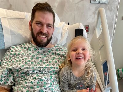 Don Chesler and daughter Madelyn, 3, preparing for his first round of chemotherapy at The Arthur G. James Cancer Hospital in November 2022.